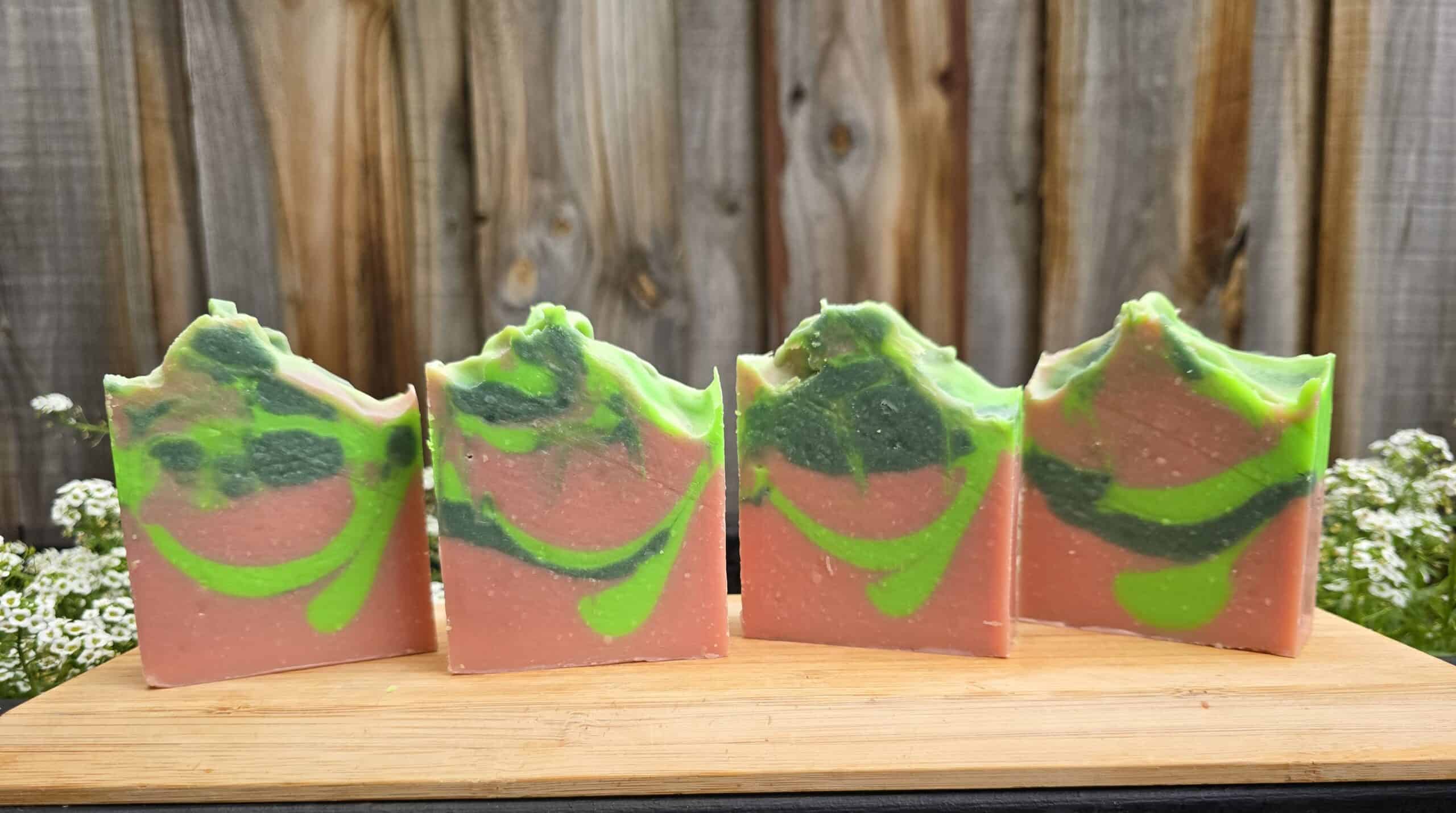 Saponified Coconut Oil, Distilled Water, Olive oil, Shea Butter, Cocoa Butter, Sodium Hydroxide, Castor Oil, Almond Oil, Kaolin Clay, Fragrance, (Floral), Mica; Titanium Dioxide